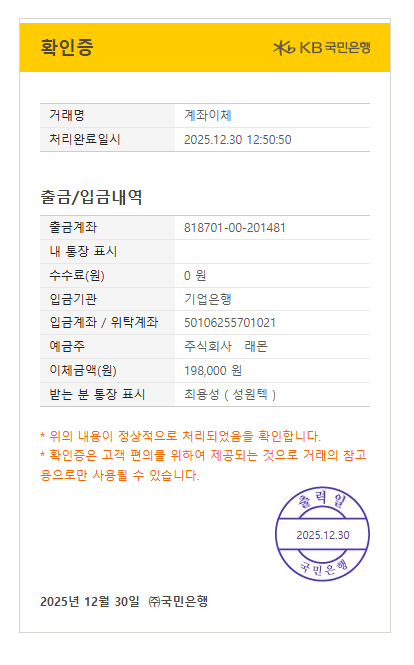 2025년 12월30일 입금건 관련 계산서 발행부탁드립니다.